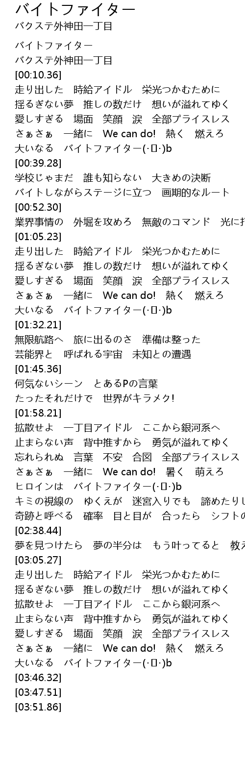 | [03:06.47] | 走り出した 時給アイドル 栄光つかむために |