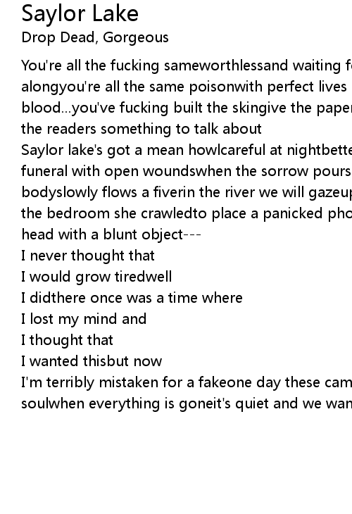 Saylor lake's got a mean howlcareful at nightbetter watch out!decorate her funeral with open woundswhen the sorrow pours like waterdown a cold and restless bodyslowly flows a fiverin the river we will gazeup the stairsdown the hallinto the bedroom she crawledto place a panicked phone callbut she was struck in the head with a blunt object--- |