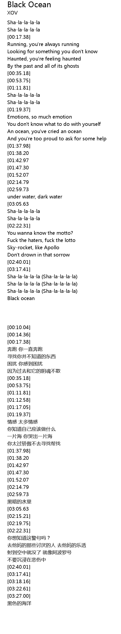 | [03:14.66][03:05.63][02:11.80][02:02.83][00:59.88][01:09.01] | Black ocean |
