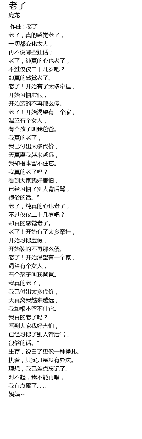 | [01:30.430] | wǒ zhēn de lǎo le, |