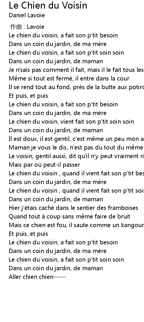 | [01:29.87] | Le chien du voisin , quand il vient fait son p'tit soin soin |