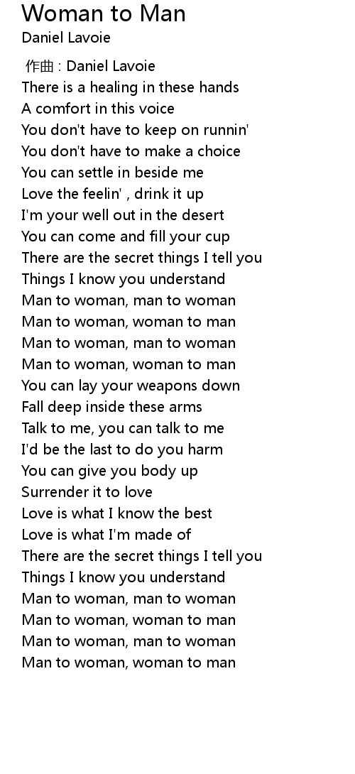 | [01:30.95] | Man to woman, man to woman |