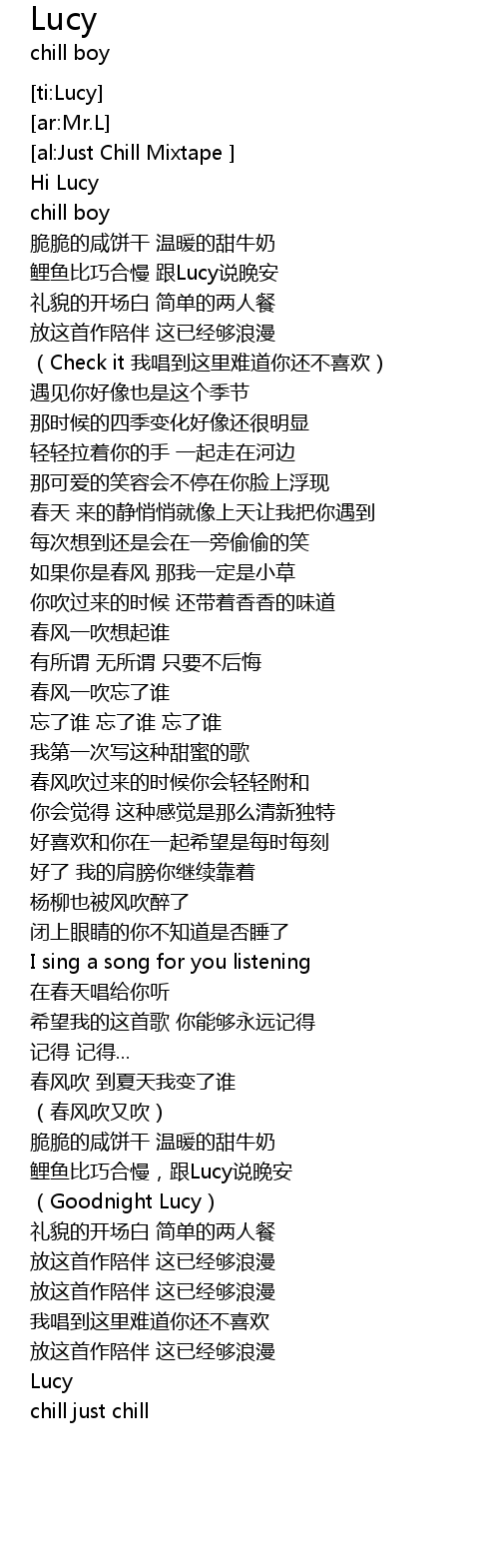 | [00:21.26] | 鲤鱼比巧合慢 跟Lucy说晚安 |