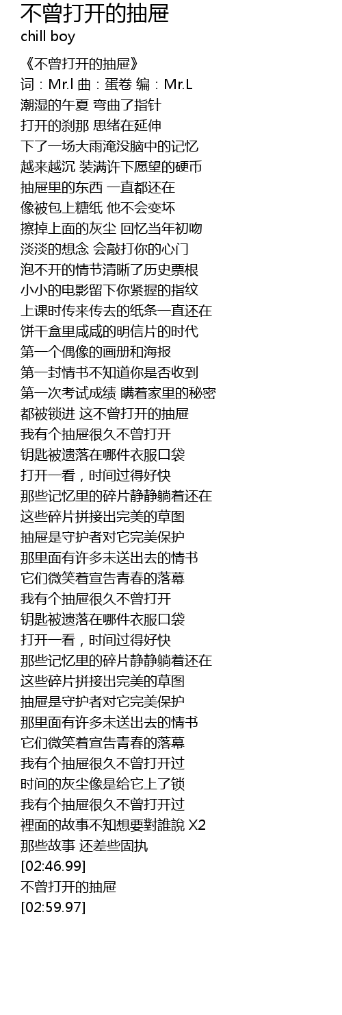 | [01:43.66] | 我有个抽屉很久不曾打开 |