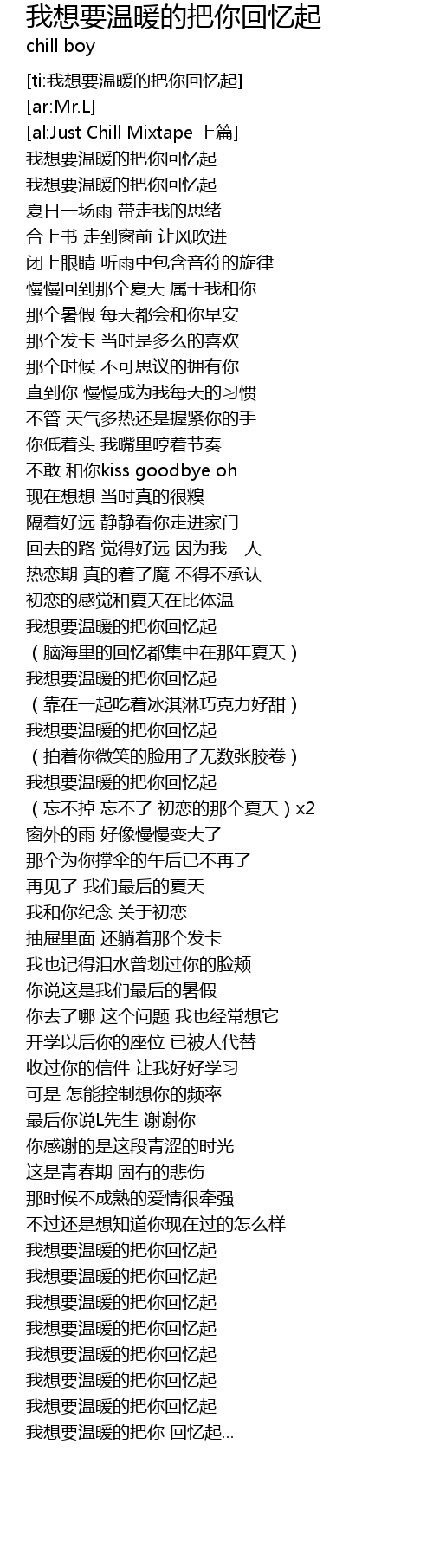 | [00:21.82] | 我想要温暖的把你回忆起 |