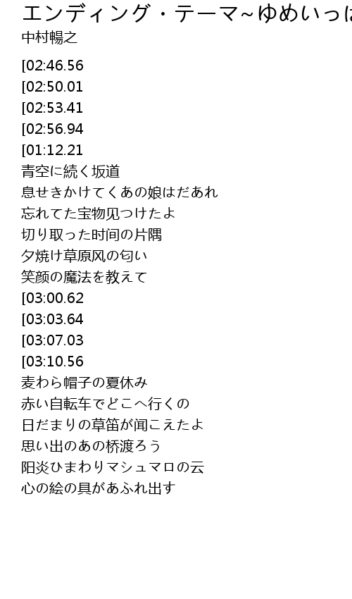 | [02:18.56] | 日だまりの草笛が闻こえたよ |