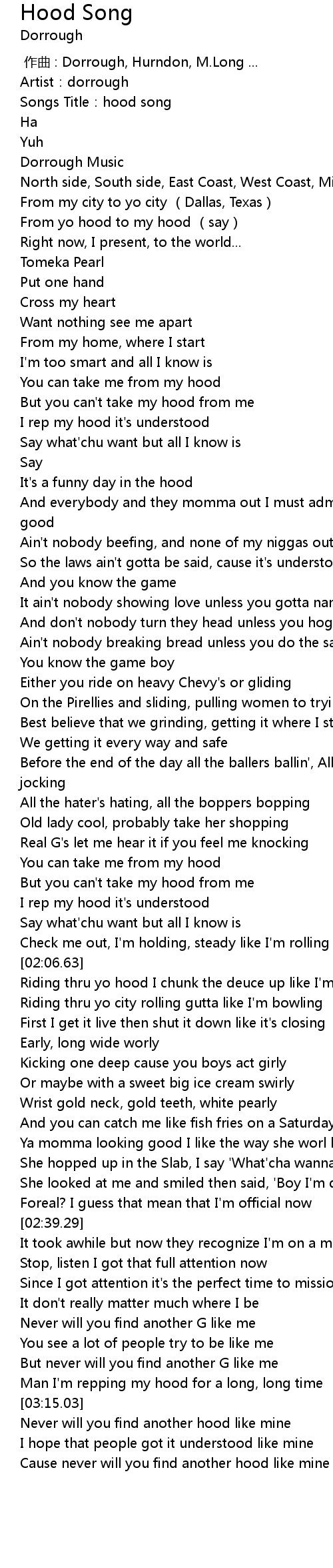 | [03:08.98] | Man I'm repping my hood for a long, long time |
