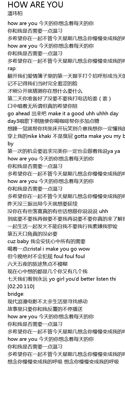| [00:00.0] | how are you jin tian de ni xiang nian zhe mei tian de ni |