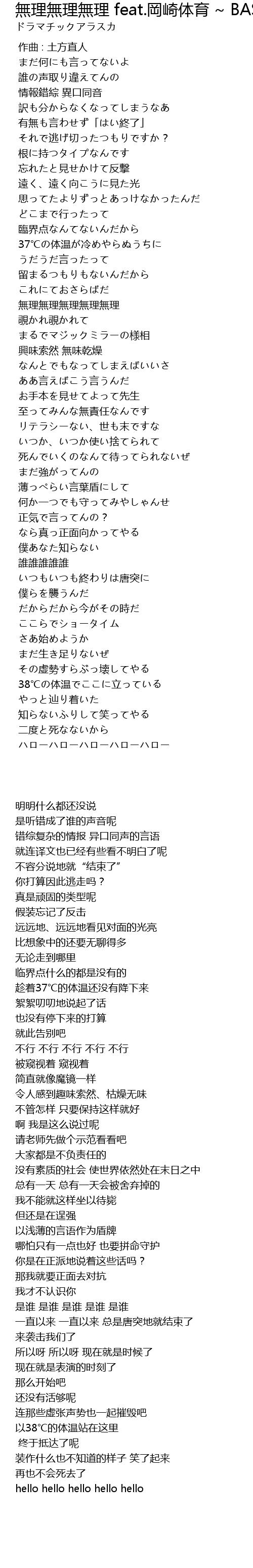 | Song | 無理無理無理 feat.岡崎体育 ~ BASIN TECHNO ver. ~ |