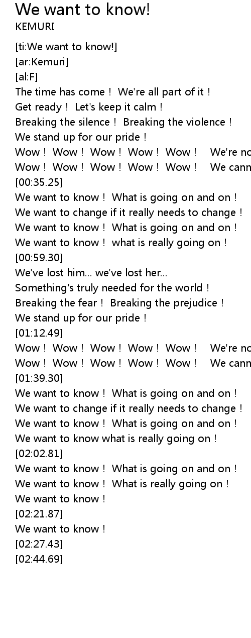 | [00:19.13] | Breaking the silence! Breaking the violence! |