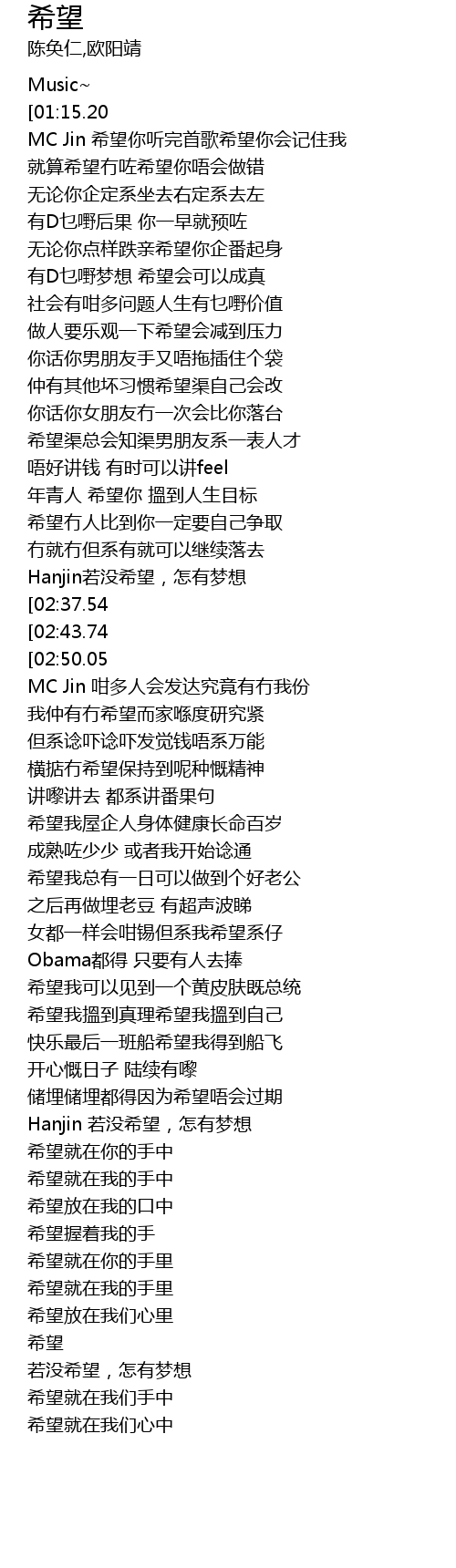 | [02:15.16] | 希望我可以见到一个黄皮肤既总统 |