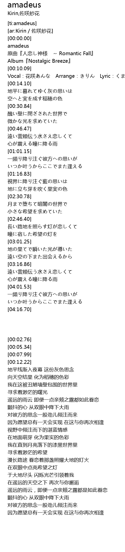 | [00:05.34] | 原曲『人恋し神様 ~ Romantic Fall』 |