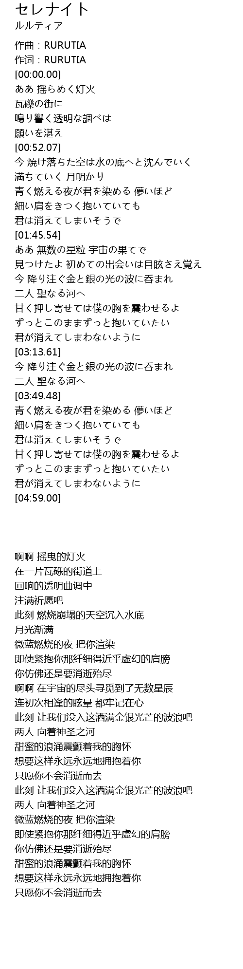 | [01:12.11] | 青く燃える夜が君を染める 儚いほど |