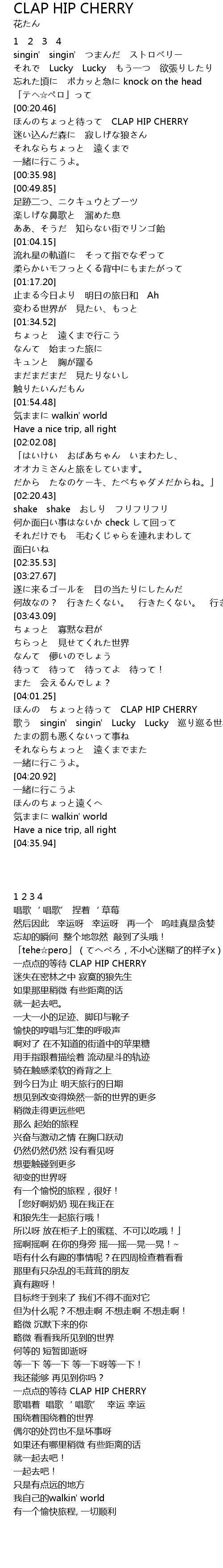 | [00:20.71] | ほんのちょっと待って CLAP HIP CHERRY |