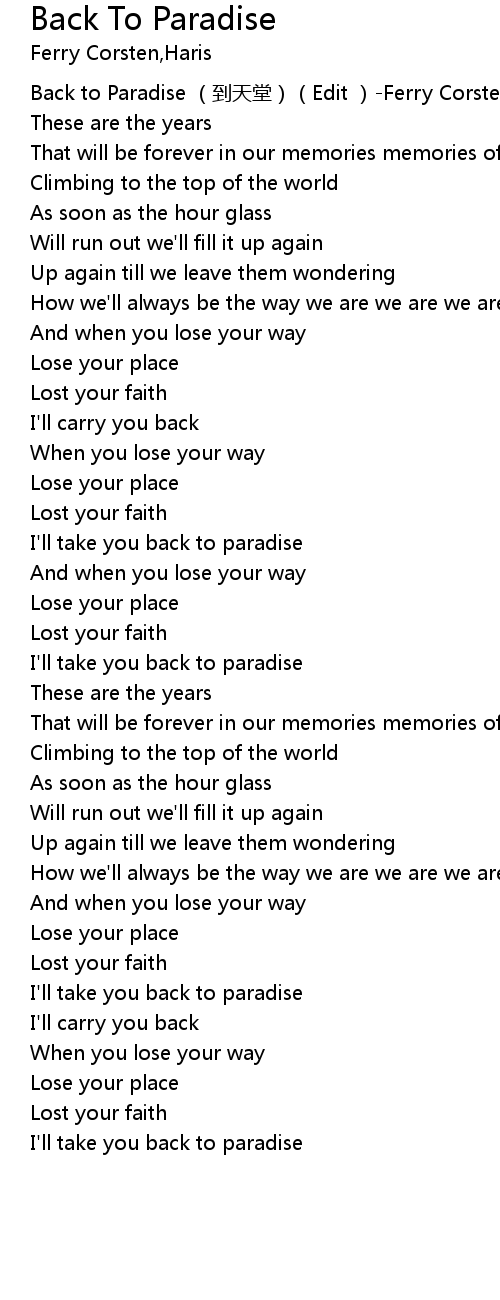 | [00:00.00] | Back to Paradise (到天堂)(Edit )-Ferry Corsten /Haris |