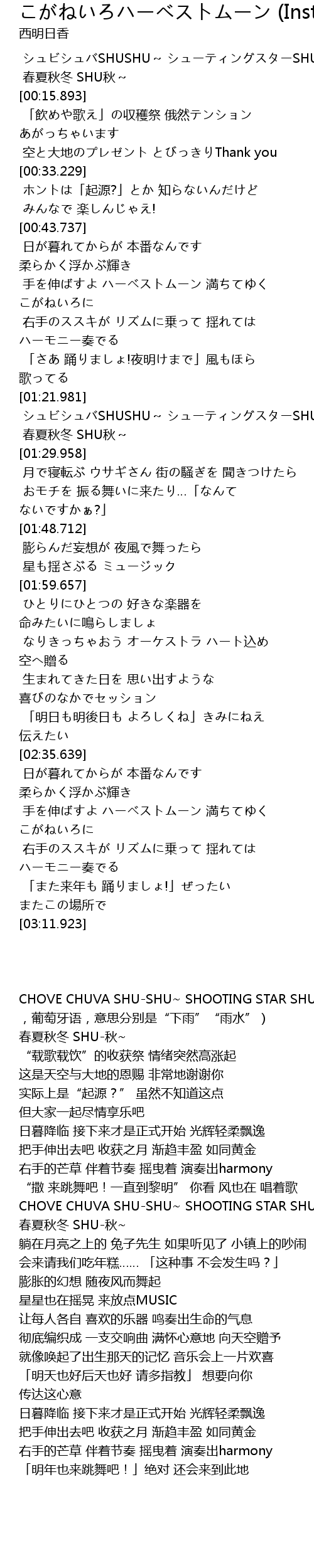 | [00:55.438] | 手を伸ばすよ ハーベストムーン 満ちてゆく こがねいろに |