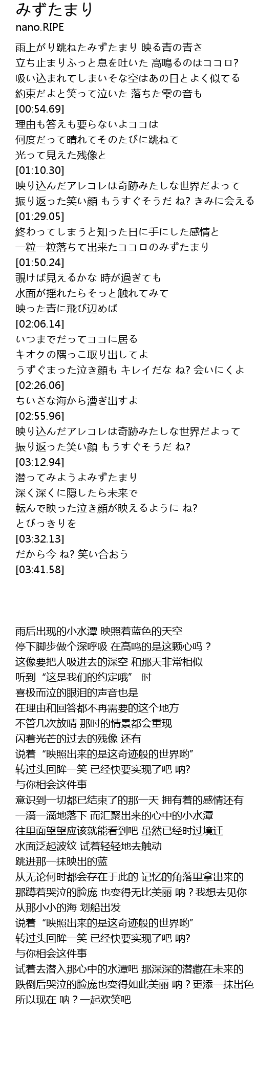 | [03:13.41] | 潜ってみようよみずたまり 深く深くに隠したら未来で |