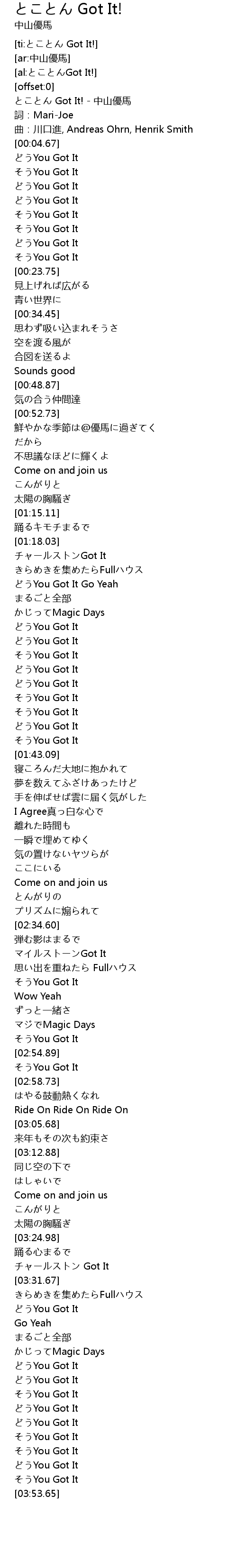 | [00:00.67] | とことん Got It! - 中山優馬 |