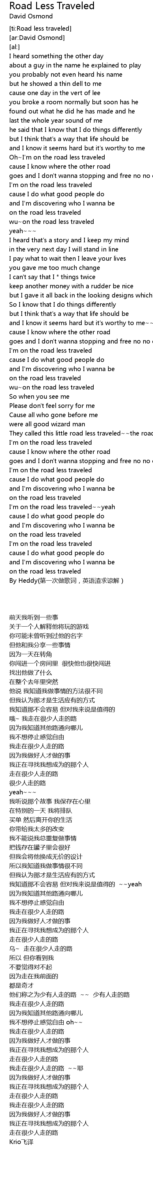 | [02:41.17] | They called this little road less traveled~~the road less traveled |