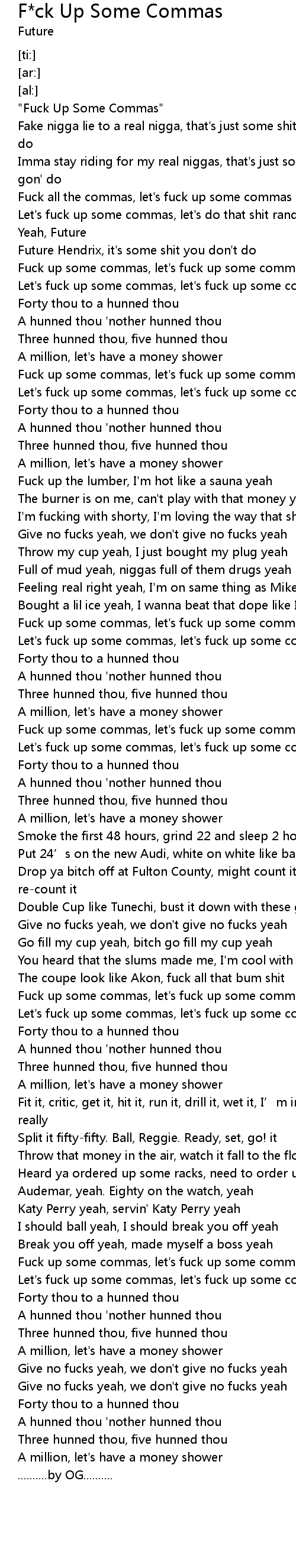 | [00:41.74] | Fuck up some commas, let' s fuck up some commas yeah |