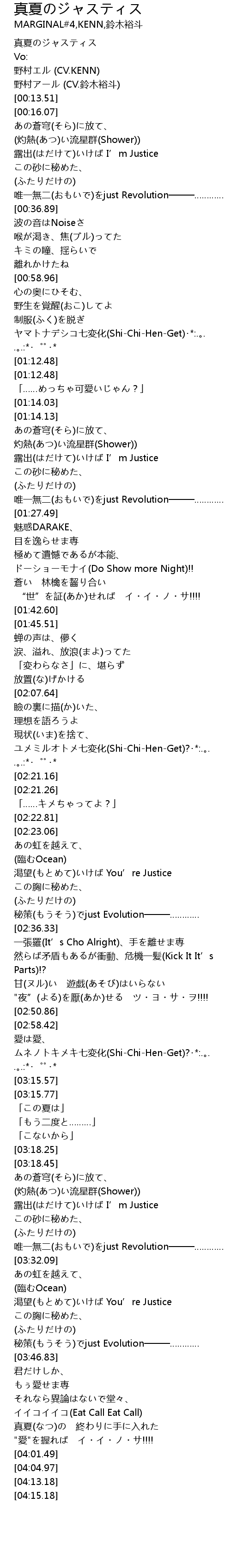 | [03:22.43] | 露出(はだけて)いけば I’m Justice |