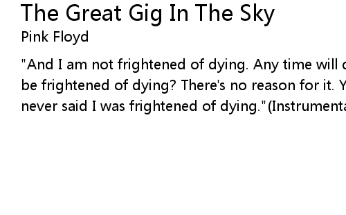 | "And I am not frightened of dying. Any time will do, I don't mind. Why should I be frightened of dying? There's no reason for it. You've gotta go sometime.""I never said I was frightened of dying."(Instrumental) |