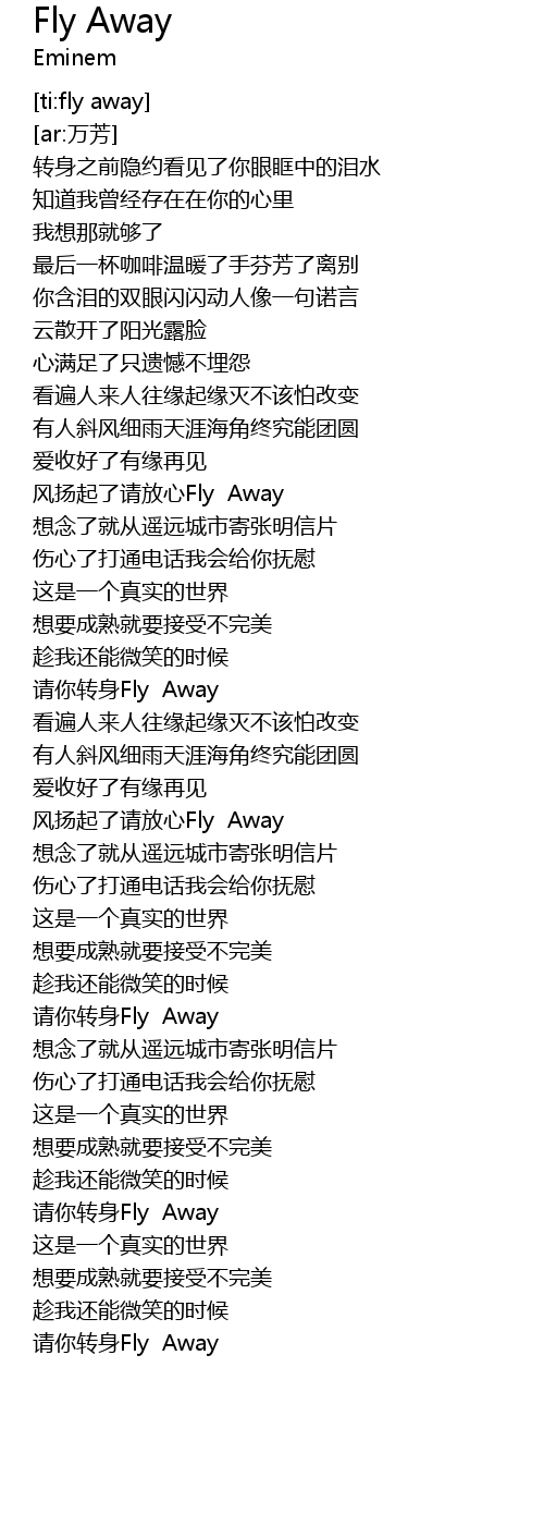 | [03:28.389] | qǐng nǐ zhuǎn shēn Fly Away |