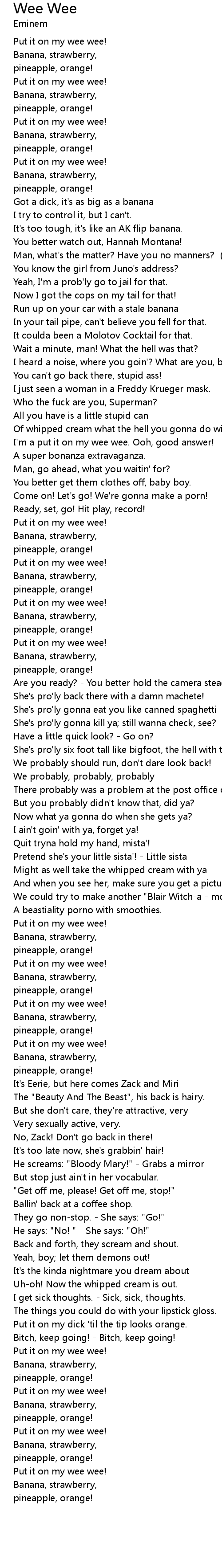 | [00:12.85] | Got a dick, it's as big as a banana |