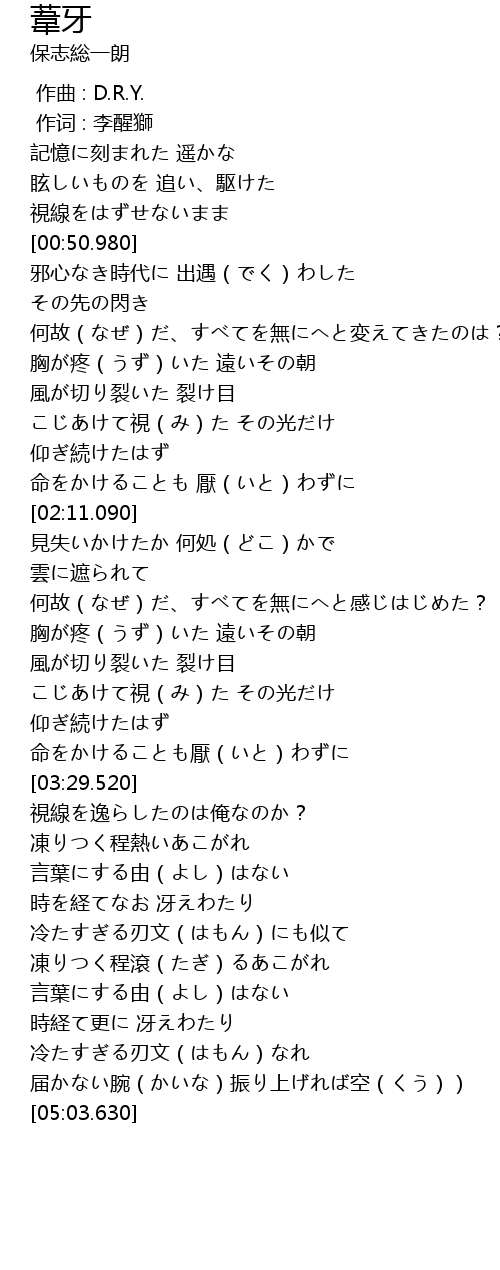 | [04:11.820] | 時を経てなお 冴えわたり 冷たすぎる刃文(はもん)にも似て |