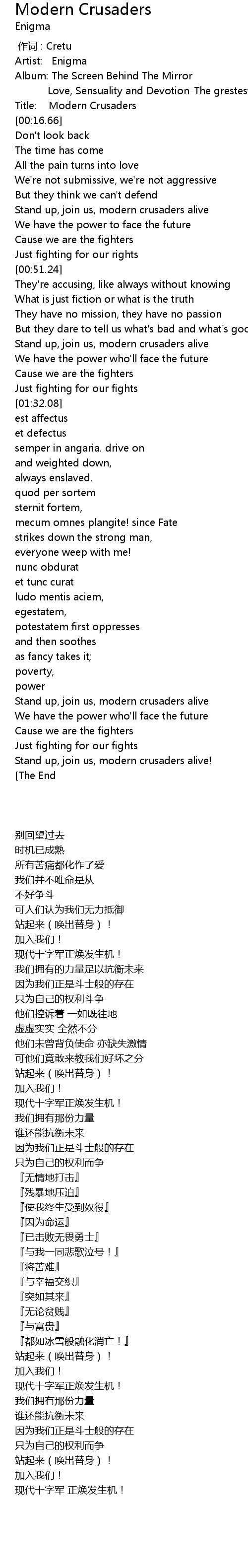 | [01:15.07] | Stand up, join us, modern crusaders alive |