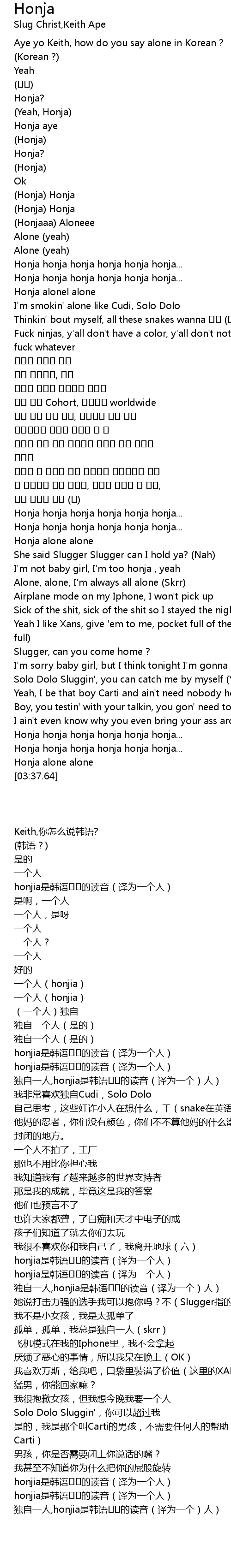 | [00:01.42] | Aye yo Keith, how do you say alone in Korean ? |