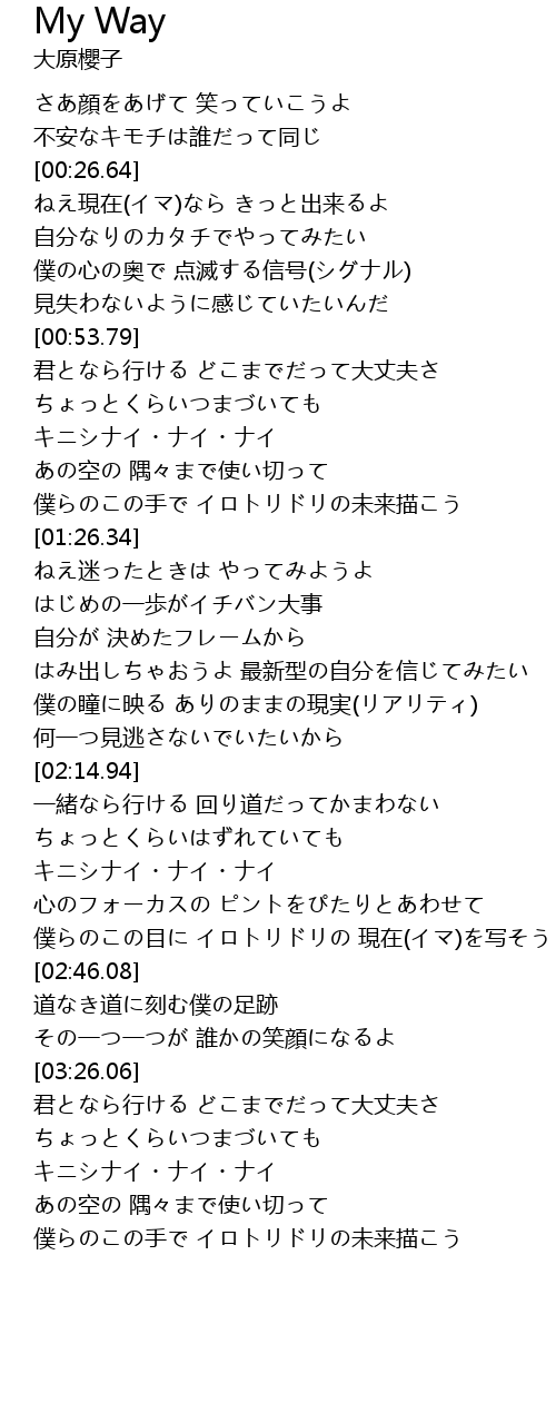 | [02:22.83] | ちょっとくらいはずれていても キニシナイ・ナイ・ナイ |