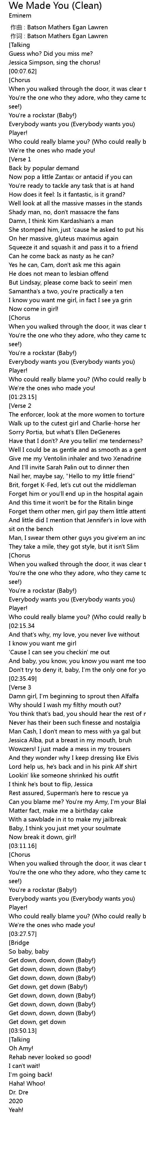 | [00:00.687] | 作词 : Batson Mathers Egan Lawren |