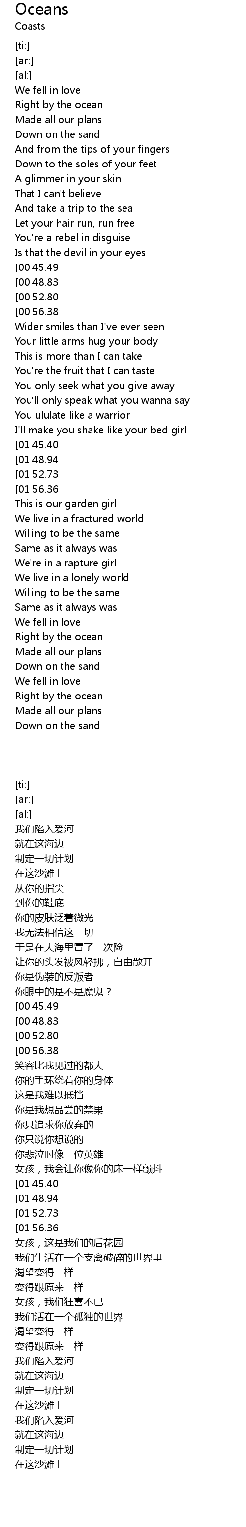 | [02:03.96][01:48.94] | Right by the ocean |
