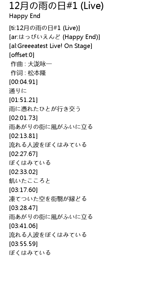 | [01:53.68] | 雨に憑れたひとが行き交う |