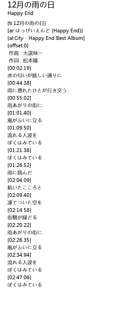 | [00:45.72] | 雨に憑れたひとが行き交う |