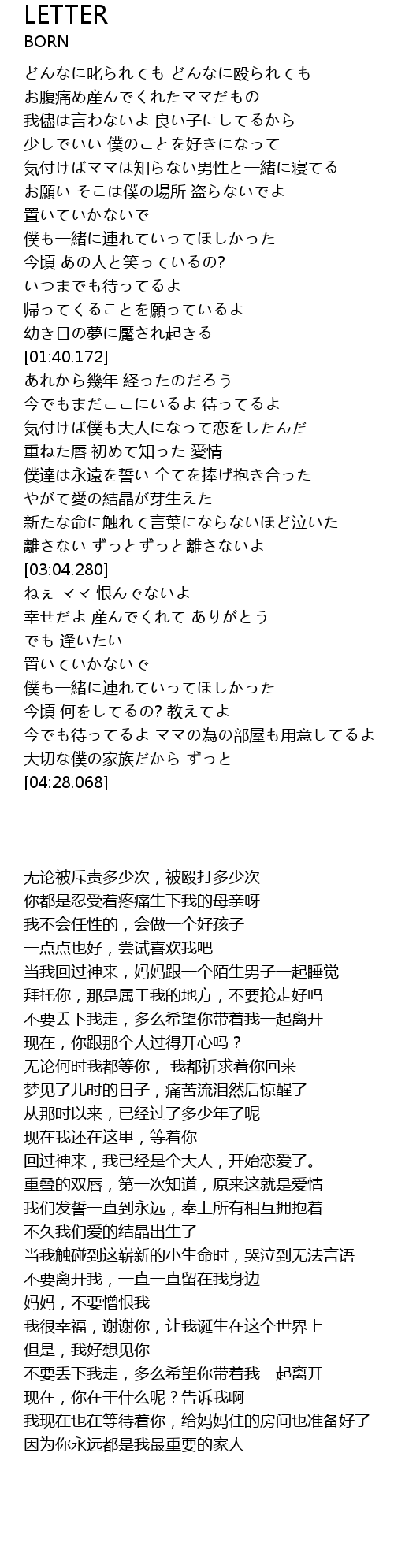 | [04:07.596] | 今でも待ってるよ ママの為の部屋も用意してるよ |