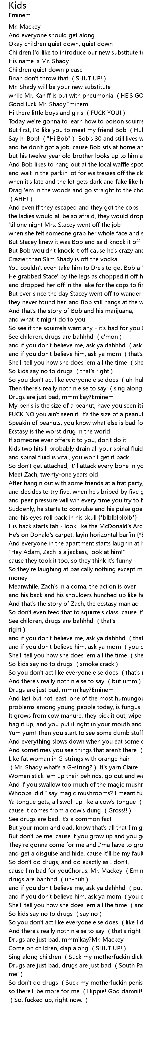 | [02:47.93]So don't even feed that to squirrels class, cause it's bad for youChorus: Mr. Mackey (Eminem)] | See children, drugs are bahhhd that' s right |