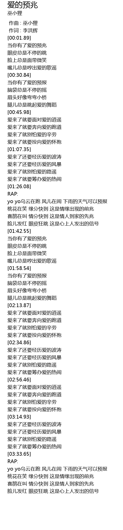 | [03:34.67] | yo yo乌云在跑 风儿在闹 下雨的天气可以预报 |