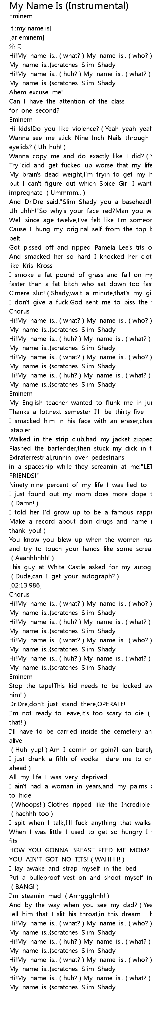 | [02:19.218] | My name is..{scratches Slim Shady |