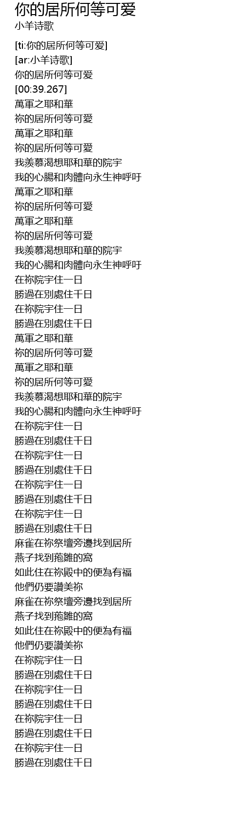 | [01:52.989] | 我羨慕渴想耶和華的院宇 |