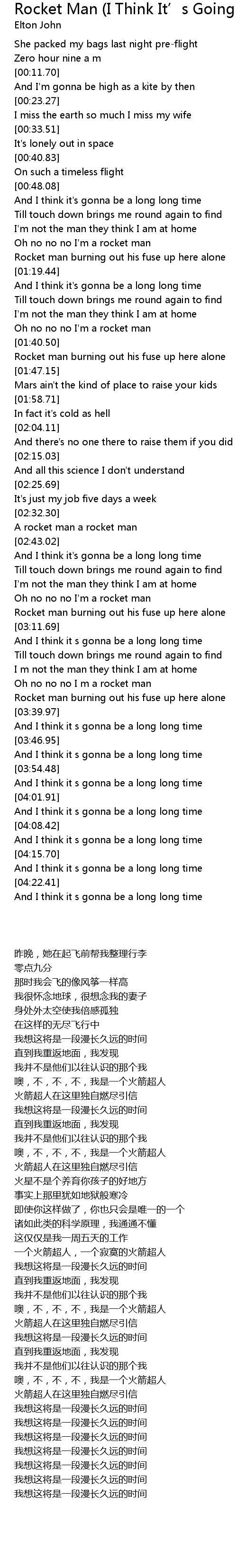 Rocket Man (I Think It’s Going To Be A Long, Long Time) Rocket Man I Think It' s Going To Be A Long, Long Time Lyrics