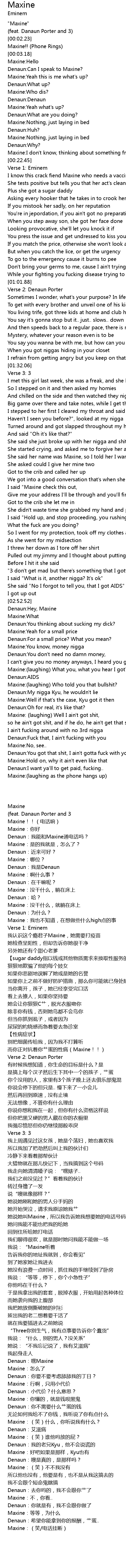 | [00:23.93] | I know this crack fiend Maxine who needs a vaccine |