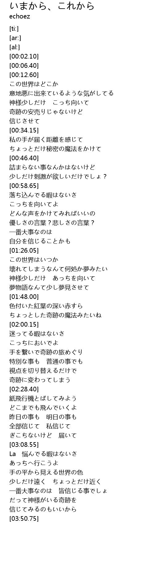 | [02:06.35] | 手を繋いで奇跡の旅めぐり |