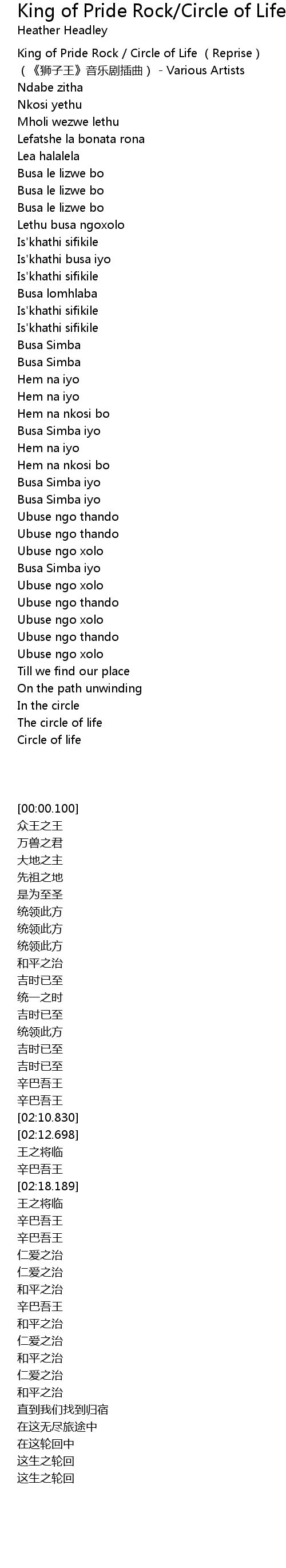 | [00:00.100] | King of Pride Rock Circle of Life Reprise shi zi wang yin yue ju cha qu Various Artists |