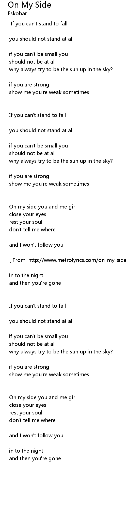 [ From: http://www.metrolyrics.com/on-my-side-lyrics-eskobar.html ] |