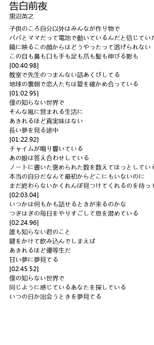 | [02:03.97] | いつかは何もかも話せるときが来るのかな |