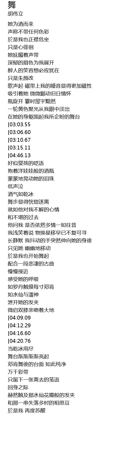 | [03:19.15][03:03.55][01:28.73][01:12.67] | 她跳着醉舞 |