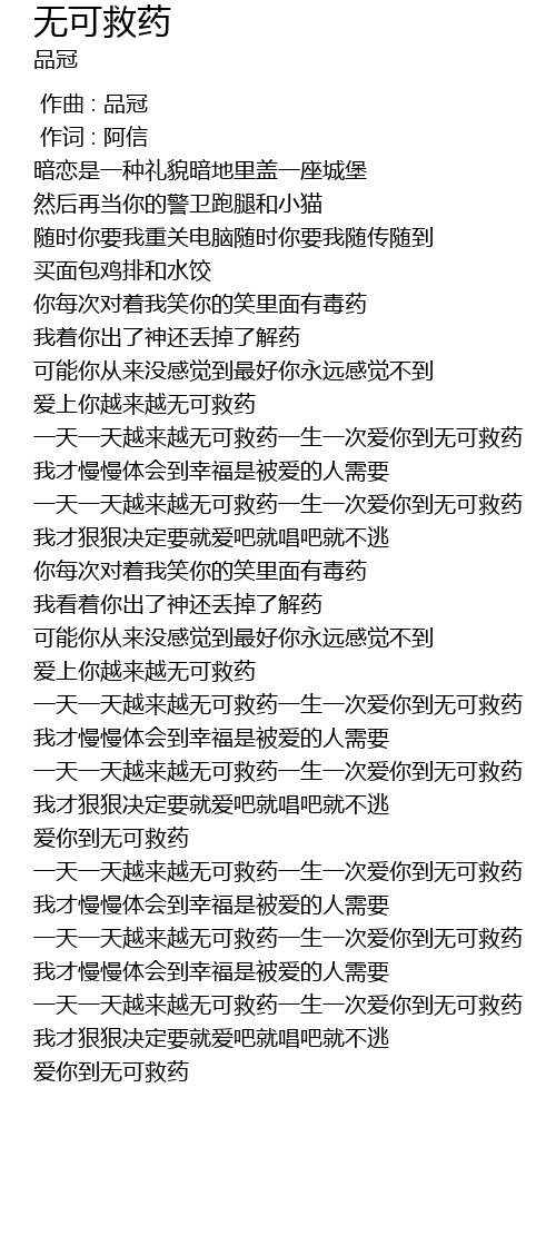 | [01:36.100] | 一天一天越来越无可救药一生一次爱你到无可救药 |