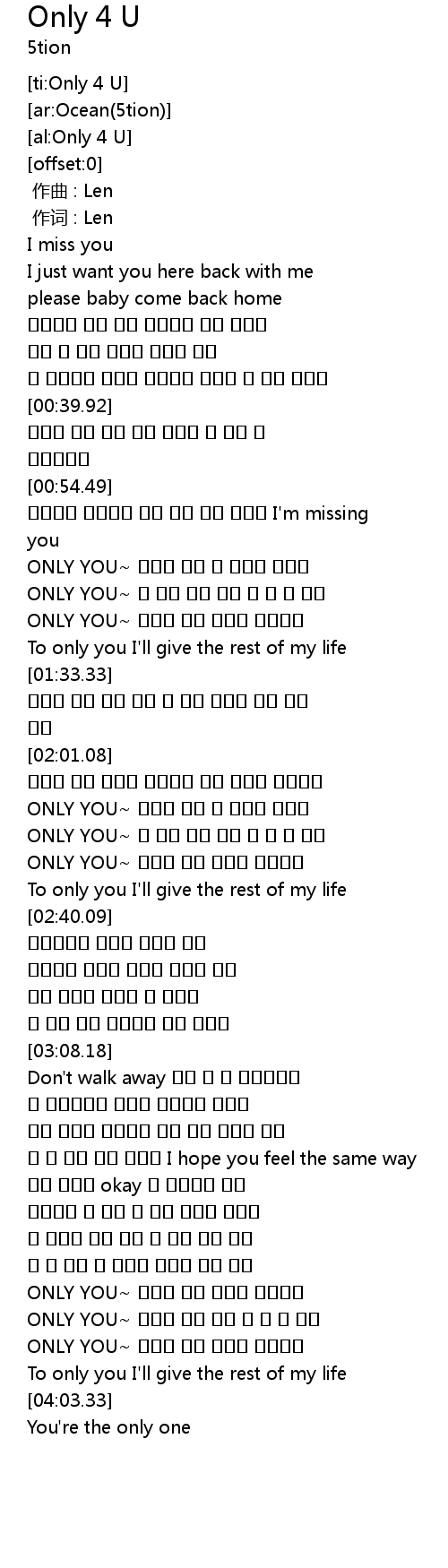 | [03:37.84] | ONLY YOU~ 약속해 이젠 떠나지 않는다고 |